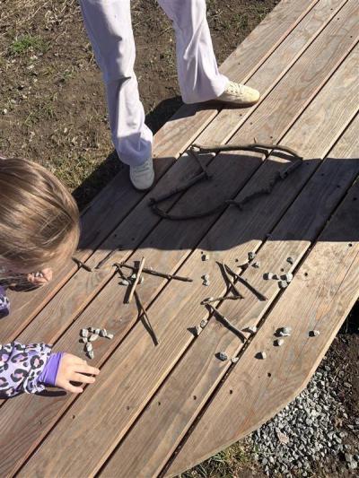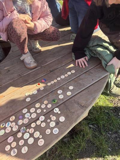 Na děti tam čekalo několik zábavných aktivit. Hráli jsme různé hry, skládali písmenka a stavěli malé domečky z přírodních materiálů. Hlavním úkolem ale bylo rozmístit na stezce kamínky, které děti předem samy namalovaly. Barevné kamínky teď dělají radost každému, kdo se po stezce projde.