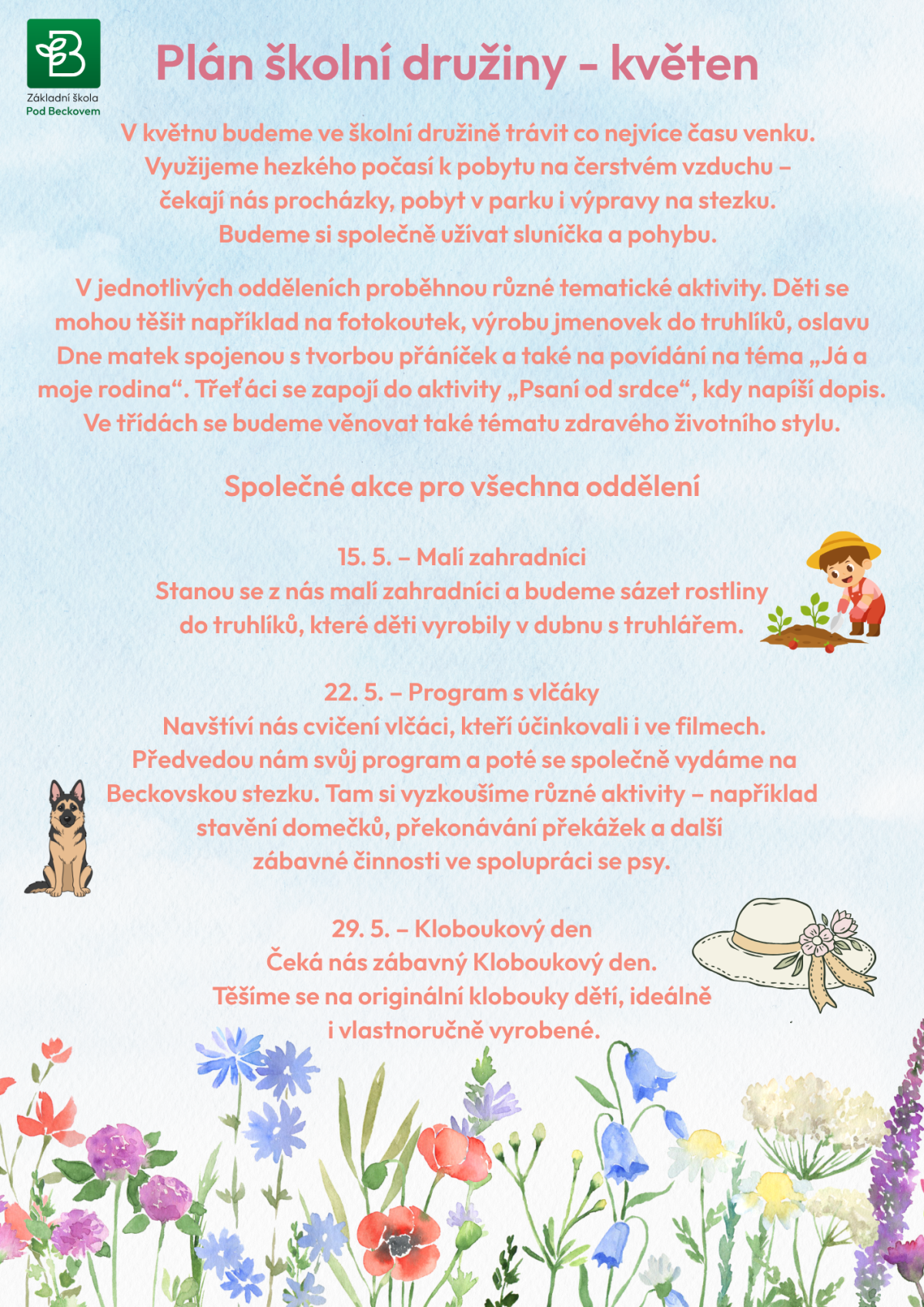 Přinášíme aktuální plán naší školní družiny na měsíc květen.