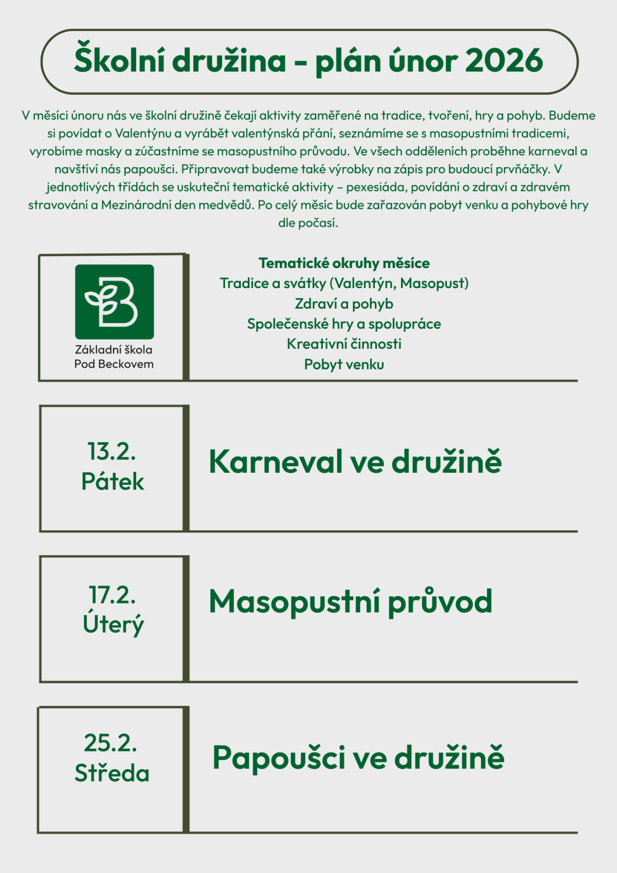 Přinášíme aktuální plán naší školní družiny na měsíc únor.