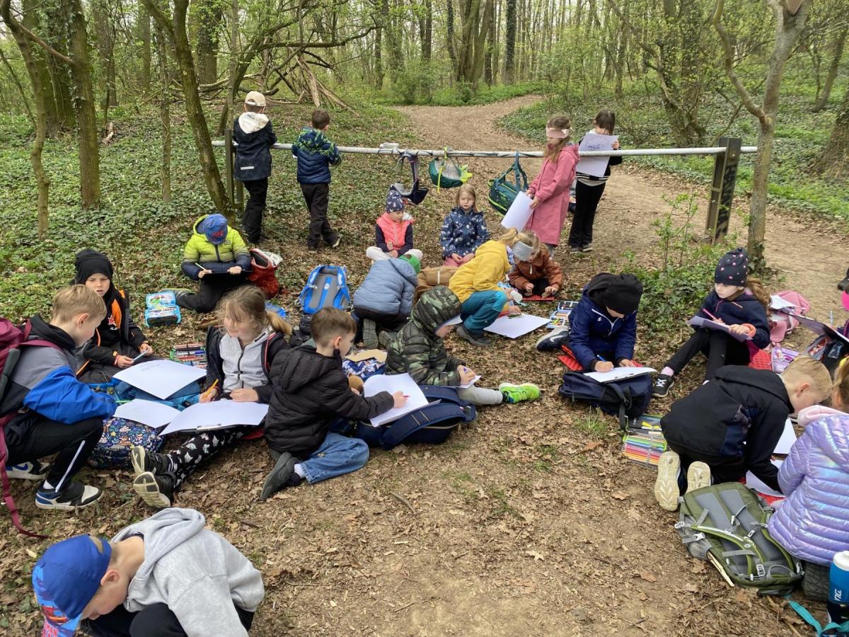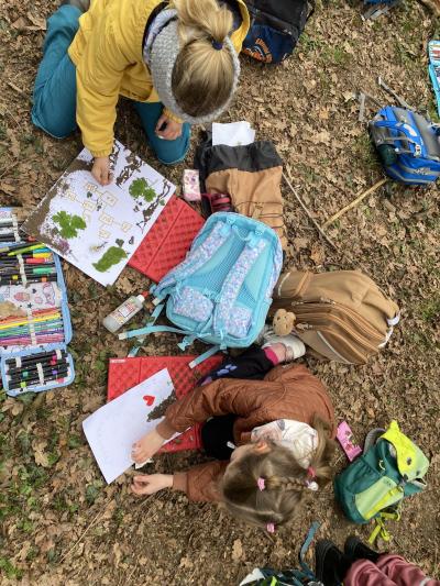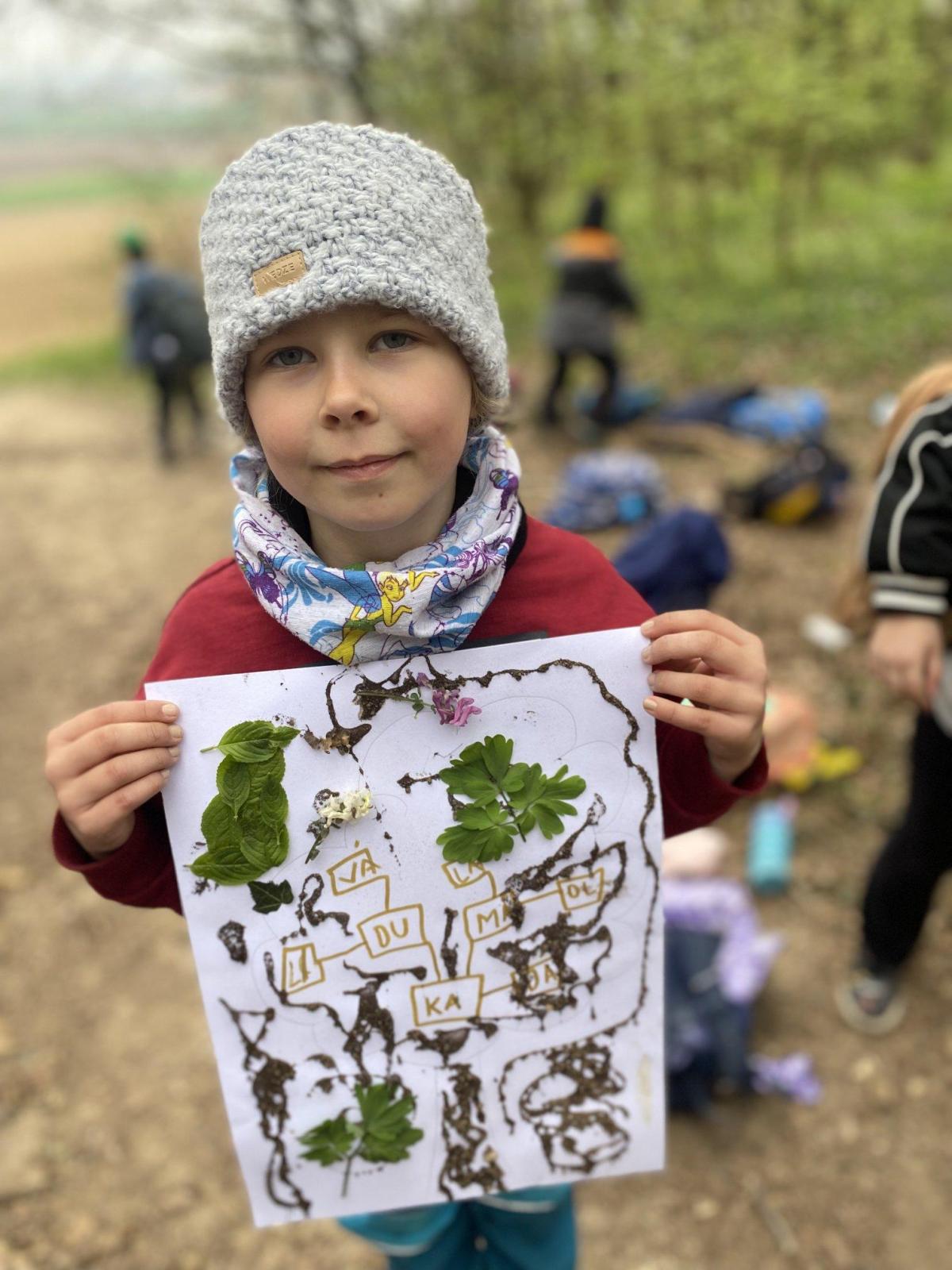 Tvoříme nápisy, které umísťujeme venku, procvičujeme psaní. Tělocvik jsme vyměnili za běhání, skoky a posilování v přírodě.